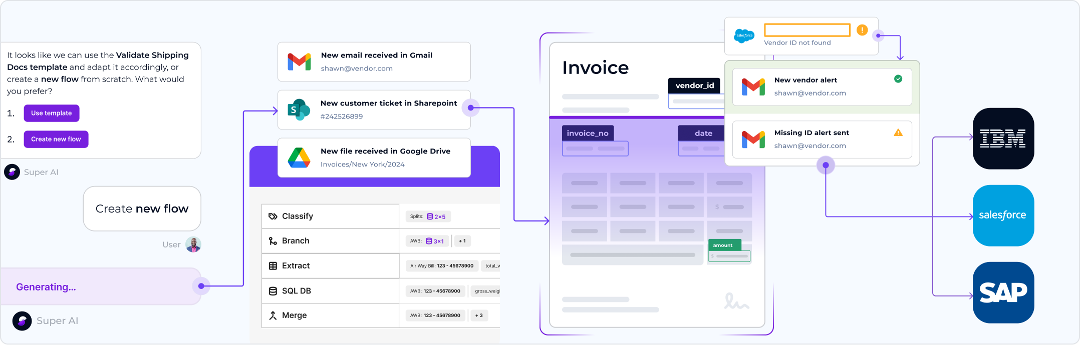 Super.ai turns your prompt into an enterprise-grade document processing workflow β no setup required.
