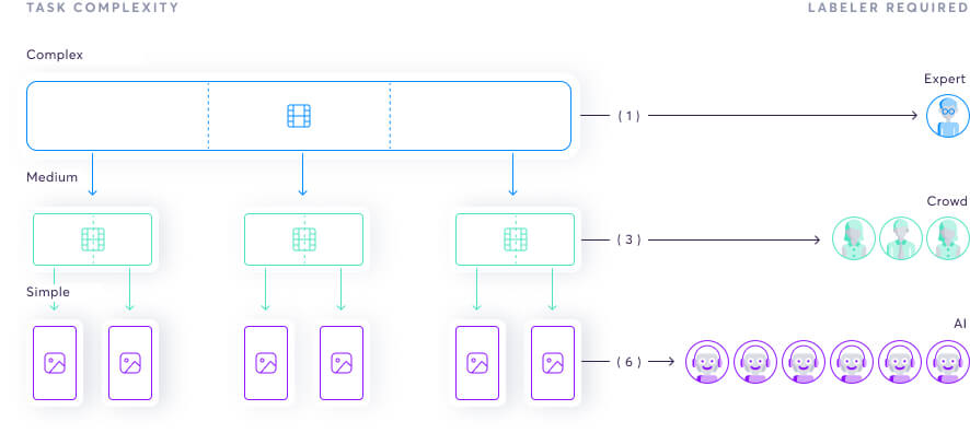 We built the super.AI system to break down complex tasks into smaller, simpler tasks. These tasks require less skill to complete, leading to lower costs. As we continue to simplify the tasks, we get to the point where there’s the potential to process the data using AI, further decreasing costs.